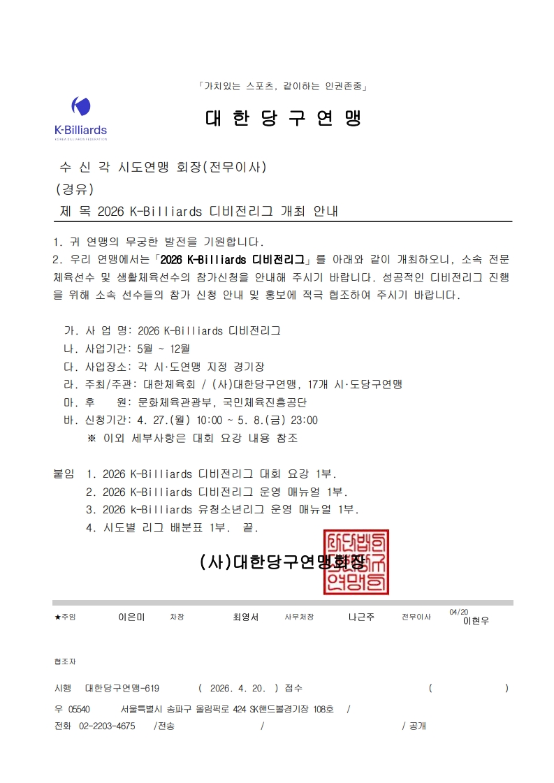 [°øÁö] [KBF°ø¹®]2026 K-Biiliards µðºñÀü¸®±× °³Ã־ȳ»